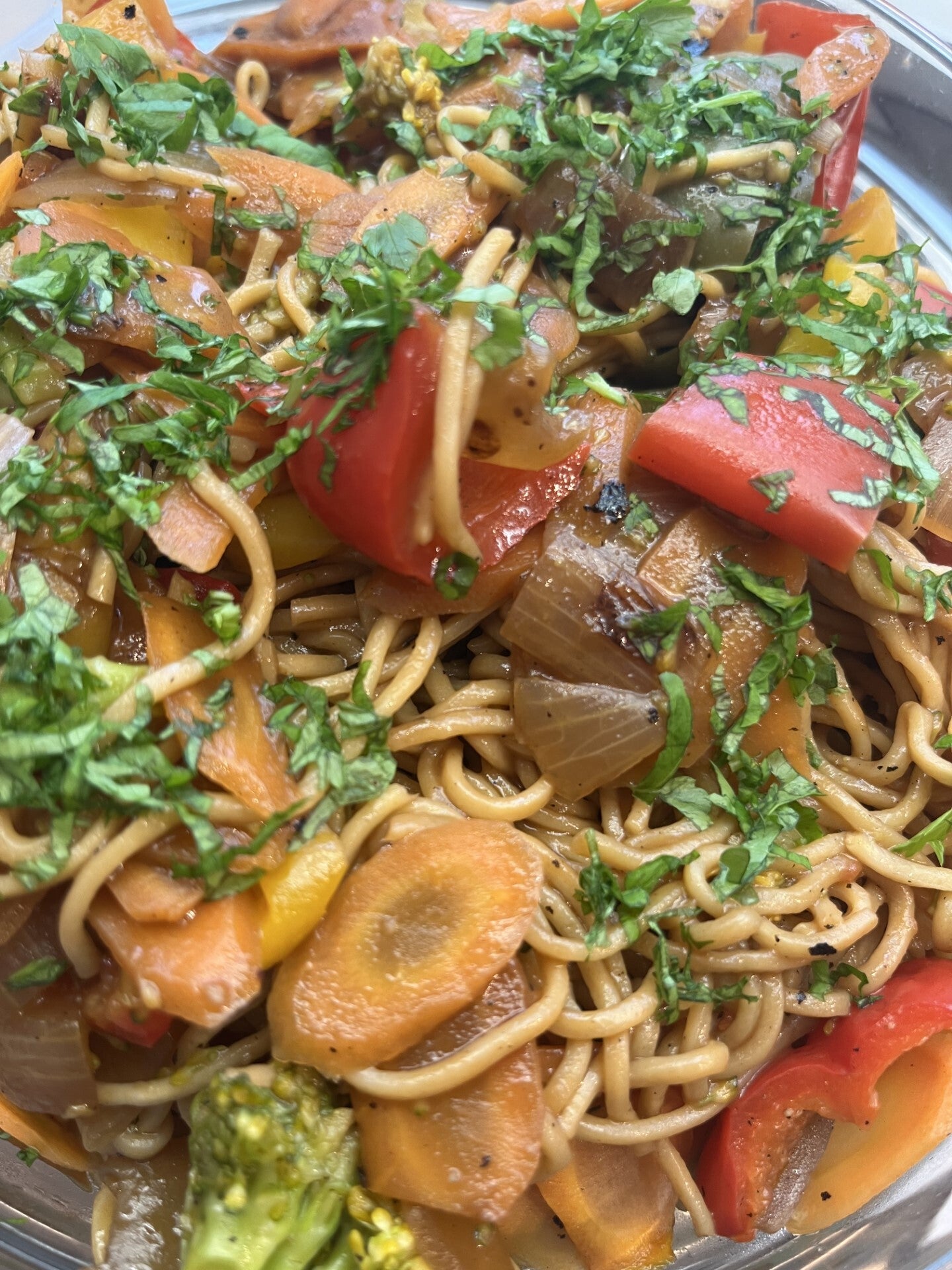 Met wortelen, paprika, pijpajuin, brocolli, ajuin